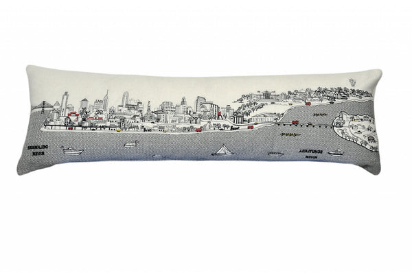 Showcase this famous city, with our Cream Color Philadelphia Daylight Skyline King Size Lumbar Decorative Pillow. The daylight view of the Philly shore line from the Schuylkill and Delaware Rivers is picturesque. The gorgeous art features many famous landmarksand references, rendering a modern whimsical way to bring this iconic cityscape to life. Made of a wool/nylon blend, this high quality stitched decorative pillow features black on white embroidered artwork mixed with pops of color that highlight important and recognizable icons from this fabulous city. This pillow makes a great gift, decorative accent and conversation piece. 4" x 45" x 14"