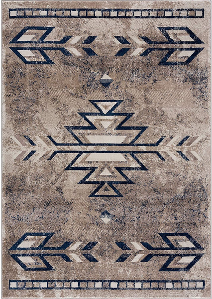 The earthy essence and bohemian nonchalance of this uniquely designed Beige and Blue Boho Chic Area Rug will bring home a countryside aura in a modern color palette. Taking inspiration from the tribal patterns, this distinctive runner rug features symmetrically designed geometric motifs in navy blue and ivory over a distressed beige backdrop for a weathered effect. Woven in Turkey by the finest artisans, this rug is made of 100% premium polypropylene that is super durable and stain-resistant to ensure the immaculate look stays the same for years to come. The high-pile construction offers a soft and sumptuous surface texture that feels cozy under the feet. With the tasteful use of bold and neutrals, this one-of-a-kind area rug will add character and personality to your contemporary living space. 66” x 45” x 0.4”