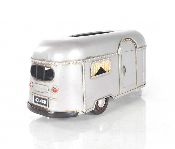 you can now take this camping tissue holder with you on your camping trip! this is a neat addition to your camping decor that is handmade using metal for long-term durability. the wheels are movable and you can easily insert napkins or tissues from the hidden door underneath the camper. item comes fully assembled. tissues not included.