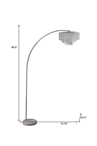 Add a bright anchor to your room with this 86" silver and white arc floor lamp with faux crystal beading. The base of this lamp is made of metal finished in a steel tone. This good-looking lamp includes a glamorous two tier cascading beaded shade. A great way to shed light over those hard to reach areas, this arched floor lamp has a single base with a straight pole that extends upwards and a long curving arm. High quality design makes this a great lamp for not only lighting, but accenting a room with style. The perfect lamp to create just the right natural and soothing light in your space. 86" H x 16.75" W x 52.5" D