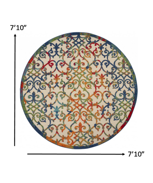 Bring a vibrant ornate look to your whole living space with this Round Rainbow Colored Indoor Outdoor Area Rug that will enliven the atmosphere in the most cheerful and colorful way. The bold use of bright reds, blues, greens, and oranges makes it stand out with an ombre color effect while still bringing the whole look together. The textured patterns make this colorful rug look and feel welcoming and enticing, making it a great accent for both indoor and outdoor settings. Made in Turkey, this rug is not only very easy to clean and maintain but also stain resistant due to the mix of durable polypropylene and the flat weave textured finish that feels luxurious under the feet and serves well in areas with heavy foot traffic. Brimming with mesmerizing design patterns in a vibrant color palette, this round area rug will uplift the aesthetics of any living space. 7'10"