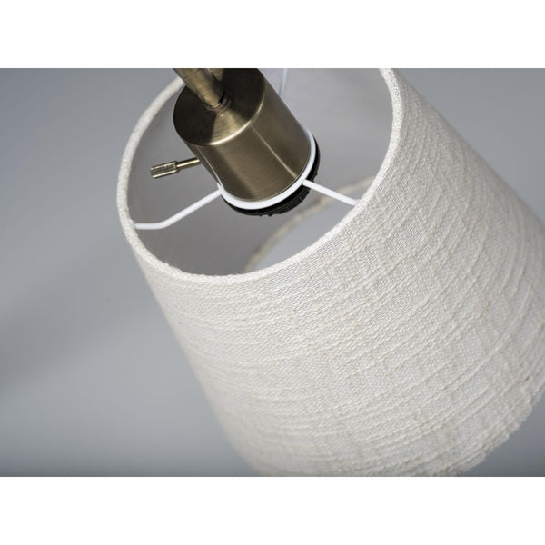 A desk lamp that can provide lighting, storage, and a charging station all in one can be found in this collection. An antique brass finish with black accents and a beautiful textured off white fabric shade make this Table Lamp not only extremely functional but stylish as well. A 7" natural wood round base has a catch-all rim for efficient storage and 1 USB port to charge your mobile devices. A black fabric covered cord finishes off the look. A rotary switch located above the socket turns the lamp on and off. This lamp is smart outlet compatible. Bulb is not included.