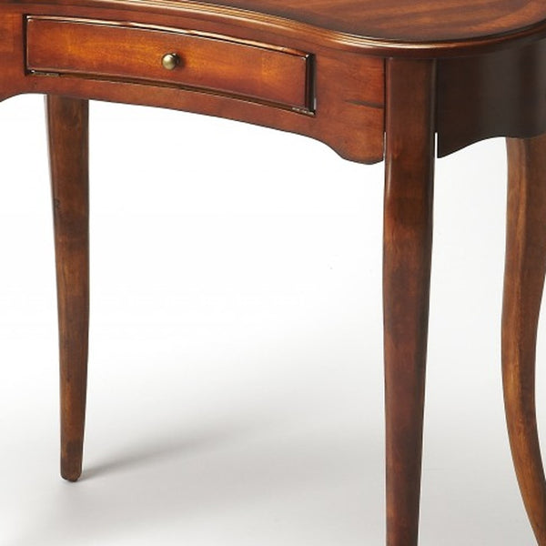 Both sophisticated and stylish the Antique Cherry Writing Desk was fashioned to enhance a beautiful space. Crafted from poplar woods and cherry veneer this crescent shaped table with an antique cherry finish is propped up on four artistically constructed cabriole legs. The single drawer affixed with a brass knob allows for effortless opening. Fabricated with soft curves and smooth edges, this desk will accentuate any space in your home. 30" x 32" x 16"