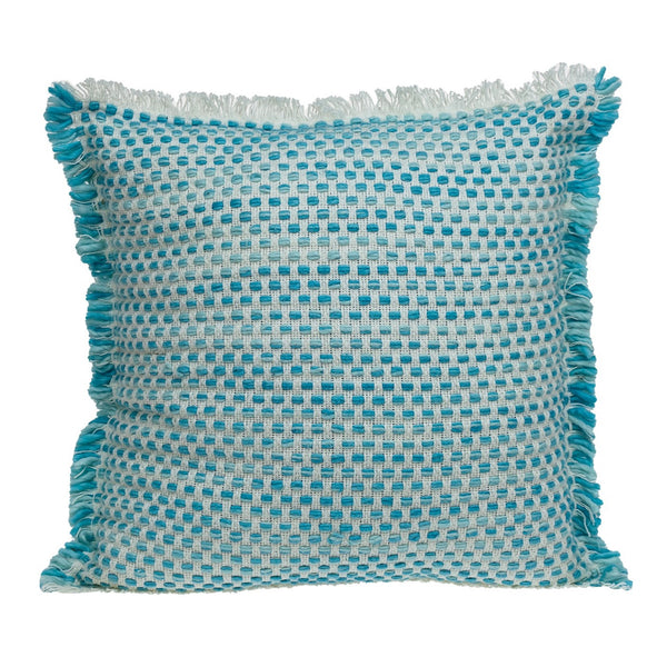 Looking to brighten a gloomy corner in your living room? Simply add this Aqua Blue Throw Pillow to the corner chair and watch the space brighten up instantly. The pillow features a solid sandy-colored base topped with chunky woven texture in aqua blue and white, which together add a pop of color to a room. The pillow is made from 100% cotton and the fringes along the edges bring about a playful feel. 20” x 20” x 5”