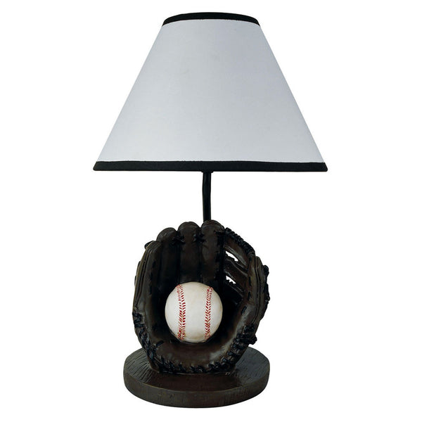 With this Baseball Themed Table Lamp you can add whimsical design and brightness to your kids' or games room instantly. The base of the lamp is made of metal and is in a round shape. On top of this base, there are a baseball glove inside of which there is a baseball. These details are colored in traditional colors with the glove in a dark brown color and the softball in a red and white colorway. The white fabric shade has black top and bottom edges and completes the look of this lamp. This lamp is unique and fun and will elevate the look of the whole room easily. 15" H x 10" W x 10" D