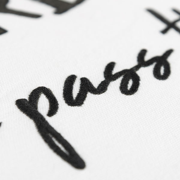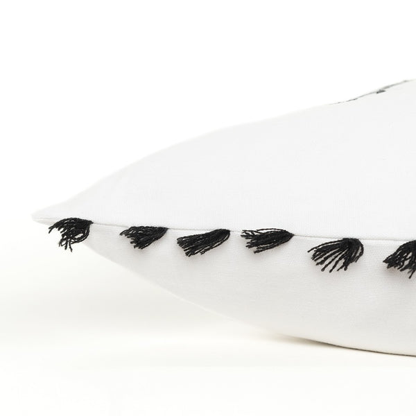 Adorn your living room with this quirky Black and White Praise The Lard Tasseled Throw Pillow that adds an element of humor with a casual vibe. A crisp white base homes a whimsically styled hand screen printing with flat running stitches embroidered to add accents and eyelash fringes for a touch of playfulness. The beautiful sentiment that says ‘Praise the Lard and Pass the Biscuits’ is contextual to the time of war and has a motivational message wrapped in humor that reminds you to stay true to your faith while still fighting the enemy with all your might. Constructed with a sturdy cotton duck material, the pillow features a solid coordinating back with a hidden zipper closure for ease of cleaning. The pillow includes a soft polyfill insert that gives it a fluffy and cuddly texture. Unique with a side of creativity, this decorative throw pillow is sure to complement all kinds of modern and contemporary décor. 20” x 20” x 6.25”