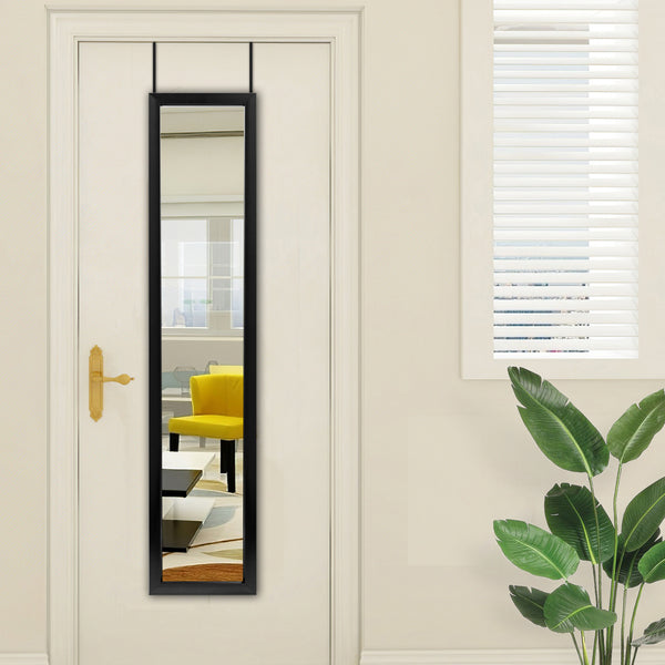 With this Black Framed Door Mount Mirror you can add a touch of elegance to any room in your home while saving space. The mirror has a rectangular shape and a thick black plastic frame around it. There are two black door mounts attached to the top of the mirror which allow you to safely and securely hang this mirror behind any door you want. Hand it up in your bedroom for last checks as you head out or in any other room to brighten up the whole space. 43.3" H x 15.7" W x 1.2" D