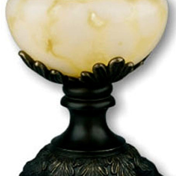 A unique light piece, this Black Metal and Alabaster Table Lamp will elevate the look of any space in your home. The base of the lamp has an ornamental shape which matches the top part of the body. The base holds up a curved alabaster body that has a yellow and white colorway. The unique body of the lamp is complimented by the simple white fabric shade that has decorative seams. This lamp can be used as a statement piece or you can use them in a pair to finish up the look of your bedroom or living room. 32" H x 19" W x 19" D