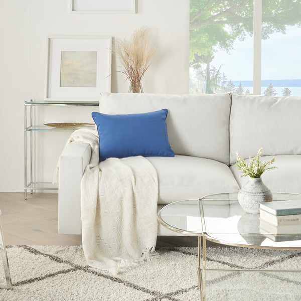 Add a bold new layer to your contemporary and modern aesthetic with this Blue Indoor Outdoor Lumbar Throw Pillow that embodies elegance and prestige. The smooth blue is sophisticated and pleasant to the eyes, making it a perfect piece for both the indoors and outdoors in your home. The immaculate look is achieved with the use of handmade smooth 100% acrylic fabric that is perfect enough to look as good on your sofa as it does poolside on your patio. The super fluffy polyester fill and the rectangular lumbar shape makes for an inseparable experience. The unique color makes for a perfect match for dark shades and pastel colors, helping bring the whole contemporary and modern look together. 14” x 20”x 5"