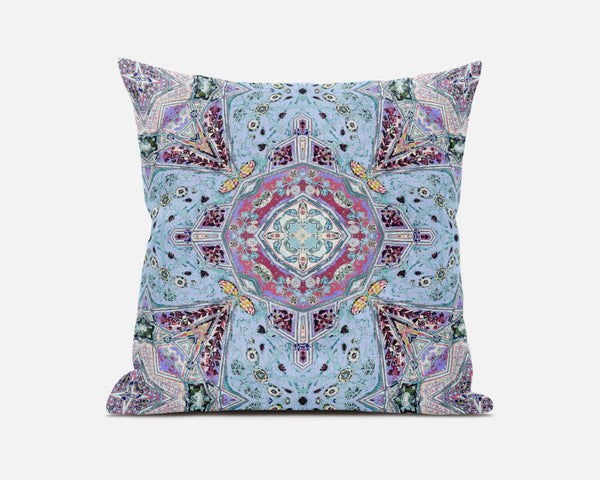 Standing out in fashion and function, this Blue Magenta Boho Chic Floral Suede Throw Pillow combines mesmerizing design elements in a vibrant color palette. This piece hosts a blend of light blue and magenta tones in flower ceremonial geometric designs for visual intrigue. The high-quality digital print on the pillow is designed to last for years while maintaining color vibrancy. Made in the USA, this pillow features durable suede fabric that has a soft and smooth surface texture, making it a fully functional and decorative piece of art that is meant to spruce up your living room. This blown pillow is filled with a durable polyfill insert which gives it a soft cushiony feel with a fluffy appearance that will add to the aesthetics and comfort of your sofa, chair, or couch. Add colors and patterns to your home with this beautiful decorative throw pillow that will stay in tune with trends and tradition. 20” x 20” x 5