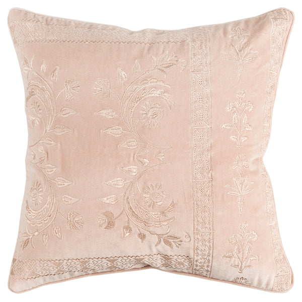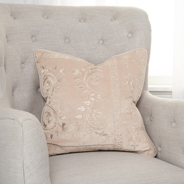 Bring an element of grace and elegance into your living space with this eye-soothing Blush Pink Floral Textured Reversible Throw Pillow. The subtle blush pink pillow has two distinctive sides, with one side featuring textured floral and geometric work woven on a soft cotton base, while the reverse side is a solid cotton velvet surface that feels smooth and luxurious on the touch. The pillow is beautifully welted to give a definite shape and outline with a hidden zipper closure at the bottom for ease of cleaning. Adorn your modern home with this soft-toned decorative throw pillow that will enhance the aesthetics of your home without being too loud. 20” x 20” x 6.25”