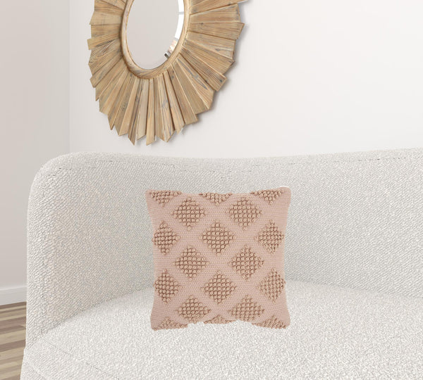 Recreate the calming and relaxing sensation of being near the sea with this Blush Textured Diamonds Throw Pillow that gives a new layer to the living experience with its decadent pattern and texture. The blush pink color and the diamond-shaped textured pattern will elevate any contemporary and casual space that it is placed in. An elevated experience is created with the use of 60% cotton and 40% polyester that is able to retain the aesthetic through the test of time. This add-on will make sure your living space is cozy and soft while being stylish according to your needs. 18” x 18” x 5”