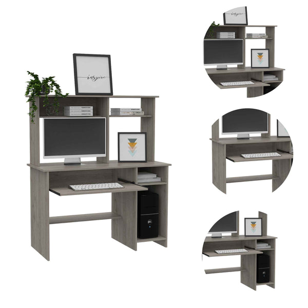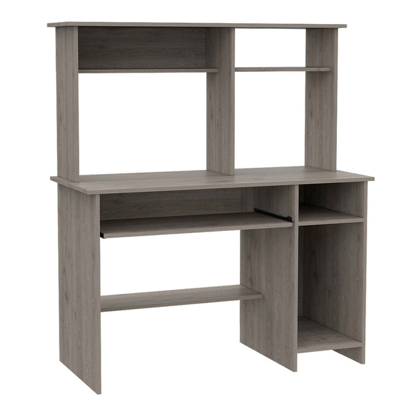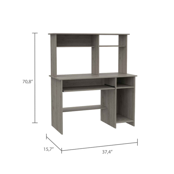 Updated and super practical, the Brion Light Gray Computer Desk is a traditional desk with a hutch that can fit anywhere. Perfectly suitable for small home offices or bedrooms. It features a practical pull-out keyboard tray so you can maximize the desk surface, many shelves, and a special shelf for your PC case. The entire desk is made from a high-quality particle board with a modern light gray finish. 71" H x 37" W x 16" D