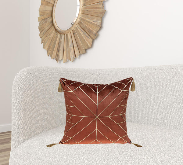 Luxury meets simplicity with the Burnt Orange and Gold Geo Velvet Throw Pillow with Gold Tassels. Beautifully handcrafted from an all velvet base, the pillow gracefully evokes a sense of charm and brings forth a little drama into your diverse space. Fascinating gold geometric patterns stitched on the soft velvet leaves a mesmerizing effect while adding character to your room. Four gold tassels adorn the four corners of the pillow that enhance the plush level. Concealed on the back is a hidden zipper under a neatly designed flap, provided for easy cleaning and removal. Enliven your home by pairing this pillow with your favorite pastel shaded decors. 12" x 24" x 4"