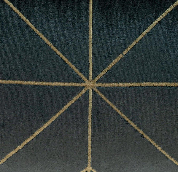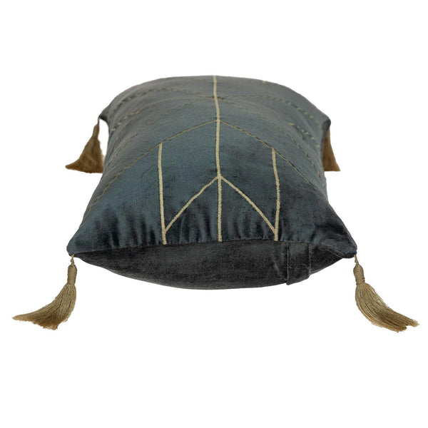 Luxury meets simplicity with the Charcoal and Gold Geo Velvet Lumbar Pillow with Gold Tassels. Beautifully handcrafted from an all velvet base, the pillow gracefully evokes a sense of charm and brings forth a little drama into your diverse space. Fascinating gold geometric patterns stitched on the soft velvet leaves a mesmerizing effect while adding character to your room. Four gold tassels adorn the four corners of the pillow that enhance the plush level. Concealed on the back is a hidden zipper under a neatly designed flap, provided for easy cleaning and removal. Enliven your home by pairing this pillow with your favorite pastel shaded decors. 12" x 24" x 4"