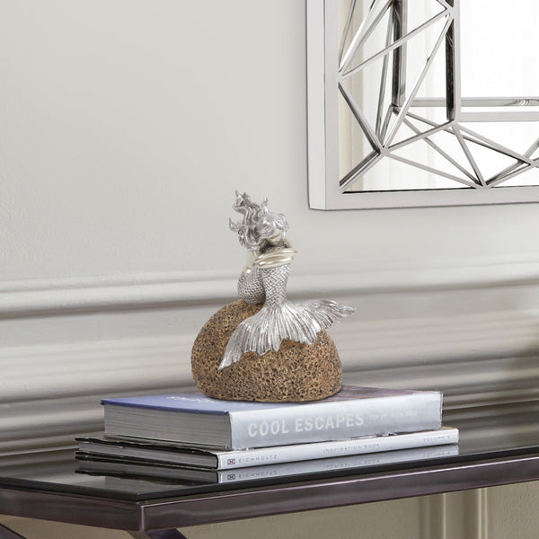 Beautiful and charming, the Contemplative Mermaid on a Rock Sculpture is a most captivating accent piece made from textured resin. Finished with great detailing, the rock is a realistic stone color while the mermaid is finished in a bright silver with black rubbed distressing and highlights. Capture the spirit of a siren of the sea with this unique tabletop sculpture. 10" x 8" x 5"