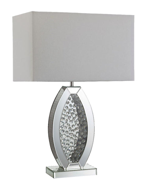 Add a touch of class and brightness to any space in your home with this Contemporary Glass Table Lamp with Rectangular Shade. The base of this lamp is made from clear glass and has a rectangular shape. Attached to this base there is an oval glass shape that has straight edges and a 3D feel to it. Inside this oval shape there is a clear glass panel that has a pebbled effect on it creating an almost art piece effect. The rectangular shade is made from plain white fabric and matches the base perfectly. This lamp can be used as a statement piece or you can buy a pair and use them in your bedroom or living room. 30.5" H x 18" W x 10.25" D