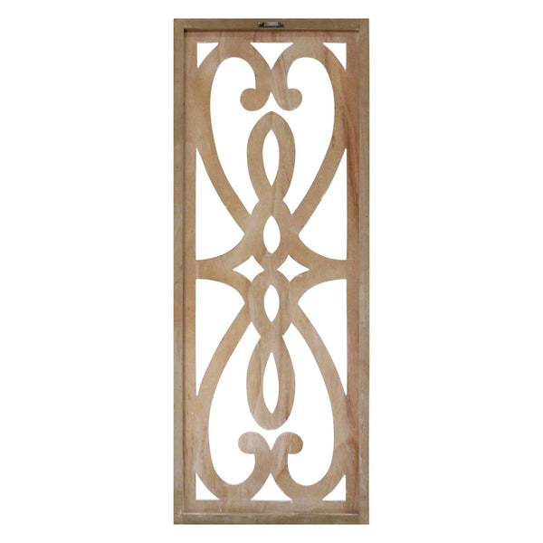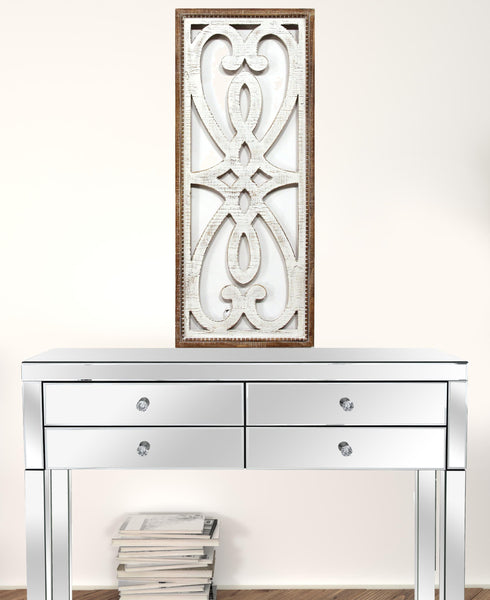 Displaying this scroll decor piece livens up a dull spot on your wall. It shows off an elegant design, inspired by hearts and flowers. The whole piece is bordered by a wooden frame, which flaunts a distressed white finish that will leave you awestruck.