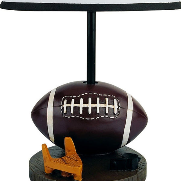 With this Football Themed Table Lamp you can add whimsical design and brightness to your kids' or games room instantly. The base of the lamp is made of metal and is in a round shape. On top of this base, there are a football, a holder, and a whistle. These details are colored in traditional colors with the football in a white and brown colorway, the holder in a yellow colorway, and the whistle in a black colorway. The white fabric shade has black top and bottom edges and completes the look of this lamp. This lamp is unique and fun and will elevate the look of the whole room easily. 15" H x 10" W x 10" D