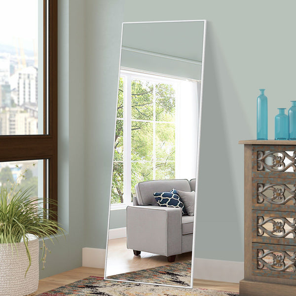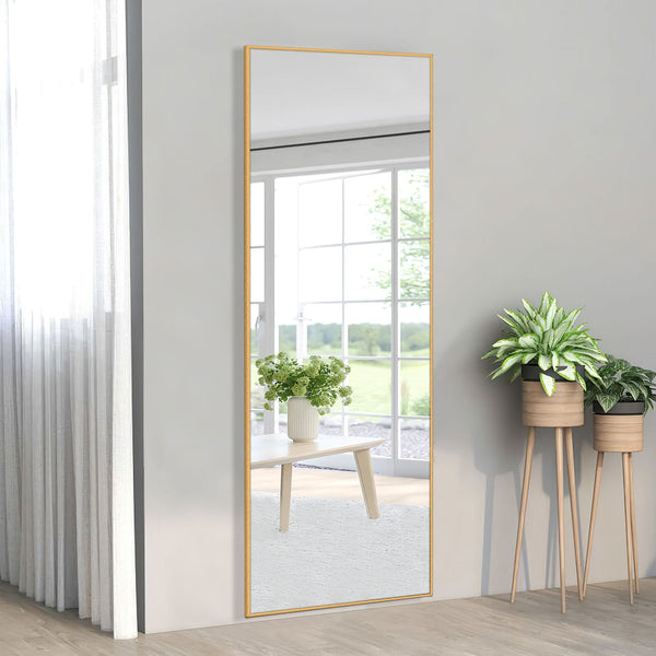 This Freestanding Gold Full length Mirror is the perfect way to add a touch of design and brightness to any room in your home. This rectangular mirror is encased in a thin gold aluminum alloy frame. This giant mirror can be used as an anchor piece in any room and will brighten and make the space seem much bigger instantly. There is a removable black colored stand to help the mirror stand up freely. Use this minimal mirror in your bedroom, your living room, or your entryway without worrying about any clashing colors or decor styles. 64.2" H x 21.3" W x 1.6" D