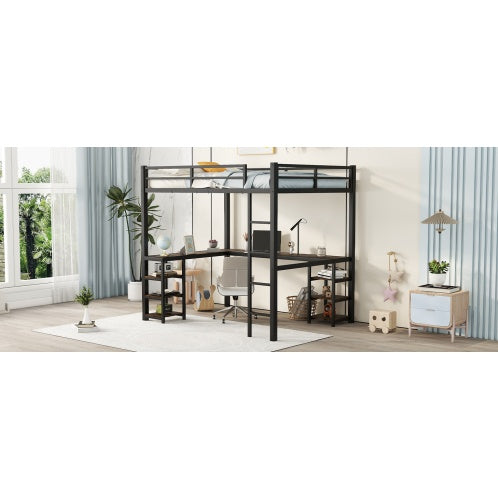 Product Name:Full Metal Loft Bed with Desk and Shelves, Loft Bed with Ladder and Guardrails, Loft Bed Frame for Bedroom, Black with Vintage wood-colored desk