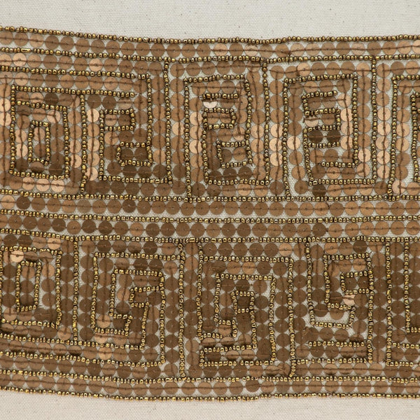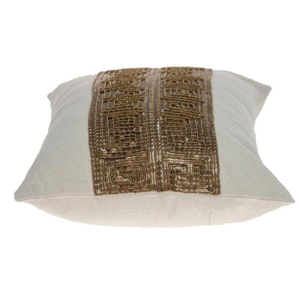 Add a Mediterranean touch to your home with the Beige and Golden Sequined Lumbar Throw Pillow. Beautifully crafted, the 100% pure cotton fabricated pillow almost instantaneously upgrades your home from subtle to glam with it's Golden toned sequins and beads. The glamourous and dazzling spangled meandros band enhances the chic quotient which rests on an all beige backdrop creating a delicate yet exquisite contrasting feature. The solid back of the pillow is unornamented and displays a hidden zipper under a concealed flap for easy insertion/removal of the cushion. Highlight your home with this embroidered throw pillow and refine your enchanting space. 14" x 20" x 4"