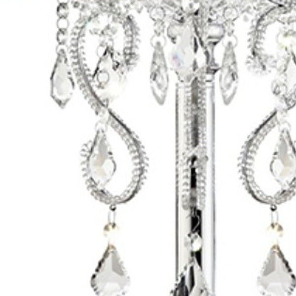 This stylish and modern Glam Silver Faux Crystal Accent Table Lamp with See Thru Shade is a great way to accent your floor space in luxurious style. Chic in a shiny silver finish, this unique table lamp is full of scroll designs that are dripping with sparkling glamorous faux crystals. To top it off, the large round shade is see-thru, helping to make this lamp truly extraordinary. This ornate yet modern lamp is ideal for living room, entrance foyer or bedroom.  35" x 22" x 22"