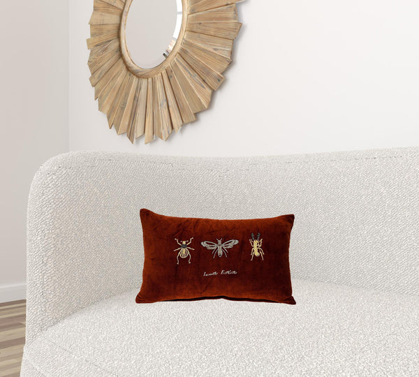 Whether you are an insect lover or just love things that are quirky and fun, this Golden Insects Velvet Throw Pillow will certainly impress you. This is a super soft rusty brown velvet throw pillow that comes with the embroidery of insects in gold. The gold embroidery looks luxurious against the solid dark brown backdrop and the pillow will make any room in your house look chic. 12” x 20” x 4”