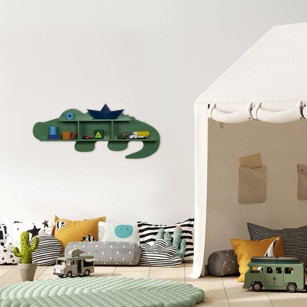 When it comes to choosing a piece for your little one’s room, everything has to reflect what they love. Having this Green Alligator Modern Wall Shelf mounted on the bedroom walls will not only keep the clutter away but also set an adventurous tone in the room. Flaunting an alligator shaped cut out in a pine-green hue, this wall shelf will maximize the wall space to showcase the toys, photos, or the favorite figurines of your kids. Featuring one enclosed cubby and 2 open-ended ones, this wall shelf provides plenty of storage space to keep your little one’s bedroom, study, or play area organized at all times. You can expect this piece to last long with its 100% MDF build while adding some playful colors to the plain-looking walls. 11” x 30” x 4.5”