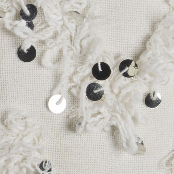 Stylish and sparkly in its decorative detailing, this Ivory Silver Chevron Sequined Throw Pillow is here to add a sophisticated spark to your modern home. The classic chevron pattern in ivory white looks dazzling with its strands of shaggy fringe embellished in silver metallic sequin for a subtle shine. Made from cotton fabric with heavy shagged fringe for added texture and dimension which is sure to accentuate a sense of modern luxury in your living space. The pillow features a solid back with a hidden zipper for ease of cleaning while the knife-edging gives the piece a definitive shape with sharp and crisp corners. Simple yet shiny in its skillful design, this decorative pillow will undoubtedly be an element of grace and elegance to your modern home. 20” x 20” x 6.25”