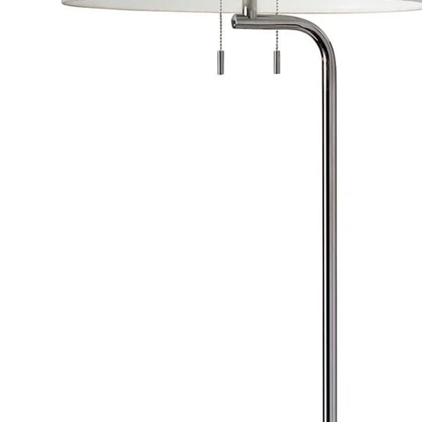 Add a sleek, modern look to your bedside or living room with this shelf floor lamp, perfect for cocktail placement. A swooping polished nickel pole holds up a large drum shade and a round, glass tabletop. With a double socket and 2 pull chain switches, you can adjust the light to suit your needs. A beautiful textured white fabric shade is paired with a chunky white marble base finish off the elegant look. This floor lamp is the perfect combination of a side table and floor lamp.