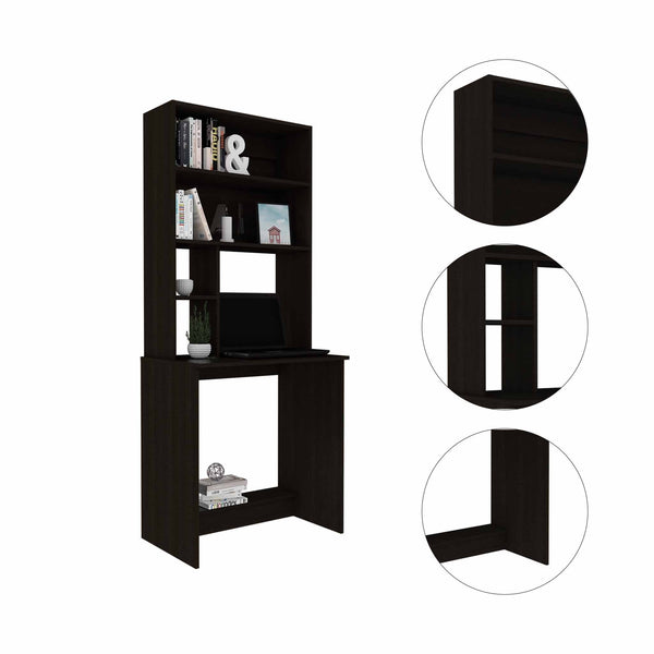 Practical and updated casual, the Milo Black Computer Desk is a traditional desk with a hutch that can fit anywhere. Perfectly suitable for small home offices or bedrooms. With is two large shelves, it can be used to store books, photos, plants, or decorations. Ergonomically designed, it features plenty of legroom(30"H) and a convenient footrest. This desk has an updated and modern look and offers lots of storage options. The entire desk is made from premium particle board with a beautiful dark black wenge finish. 71" H x 30" W x 19" D