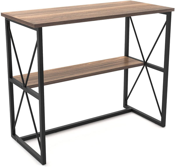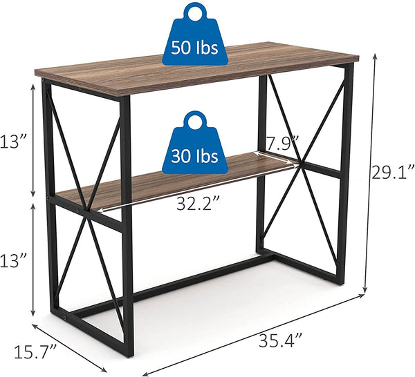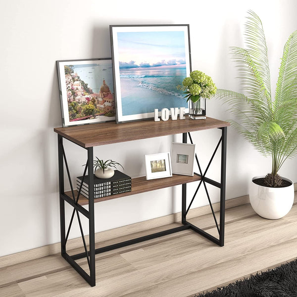 With a touch of industrialist and modern design this Mod Walnut and Black Four Console Table with Shelf is a great way to bring an attractive storage and display option to your space. Console tables are great for entrance foyer, behind the couch, against the wall in the living room or family room or office. The black square tube metal base of this open concept table makes a nice visual contrast with the walnut finish of the anti-scratch laminent tabletop and shelf. There is a contemporary styled x design to the sides that gives this table a little extra something special. Add a modern vibe to your space as you display and store books, photos, baskets, and treasured accessories in your living room, bedroom, office or even kitchen. 29.1" x 35.4" x 15.7"