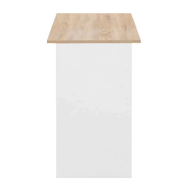 Equip your ordinary workstation to a modern home workstation with this minimalist yet functional, Modern Geo Oak and White Computer Table With Storage Shelves. It features the savvy colors of wood oak tabletop and white solid board frame. This study desk is carefully crafted with a high-quality MDF board material with PVC finish for a smooth water-resistant tabletop finish and a scratch-resistant board frame that is built to last. The two multifunctional storage shelves are to help you organize your specific needs. This work desk has a compact size yet offers enough storage space to help you accommodate all of your computer hardware in a limited place. This ergonomic design computer table is perfect for your study or work from home solution for smaller places or your modern design style. 29.5” X 35.4” X 18.9”