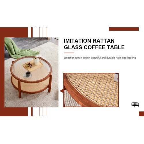 - Circular double-layer solid wood coffee table material: Crafted glass tabletop, second layer material: PE Rattan rattan, solid wood frame