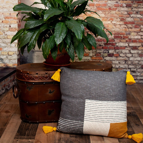 Add a bit of texture, color, pattern, and fun to your living room or bedroom with the Multicolor Knitted Throw Pillow. This is a 100% cotton knitted pillow that has different patterns in different colors, put together to form this mesmerizing and effortlessly stylish piece. The mustard-colored tassels on the four corners accentuate the whole look of the pillow. 20” x 20” x 4”