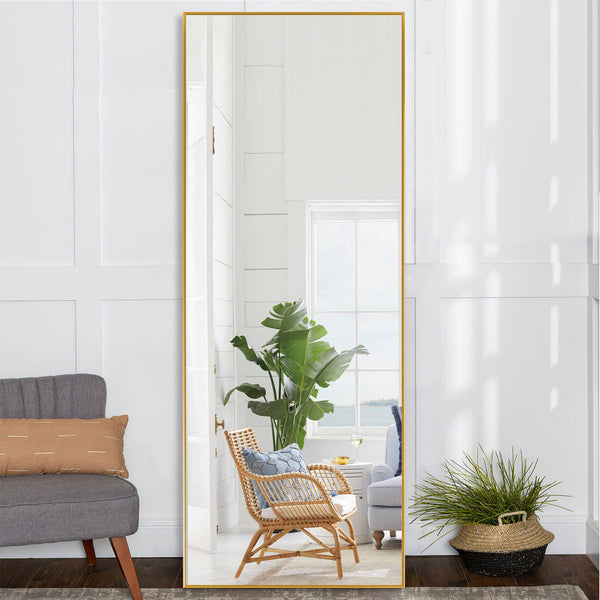 This Narrow Minimal Gold Wall Mirror will help you elevate and brighten up any space in your home. The mirror has a narrow rectangular shape with a thin gold frame. The frame is made from aluminum alloy which makes the mirror durable and light enough to hang securely wherever you want. Hang this mirror up in your closet to do last minute outfit checks, or in the bathroom as a vanity mirror - it truly is a versatile piece. 71" H x 24" W x 1.8" D