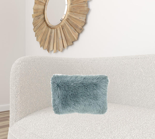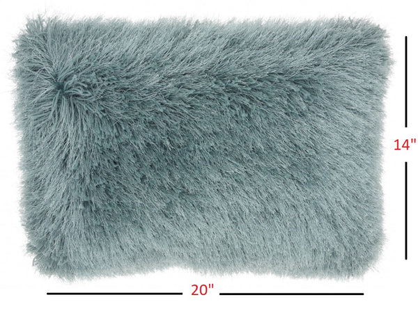 Encourage an indulgent style into your home with the addition of this luxurious and fun Pale Teal Super Shaggy Modern Throw Pillow that will uplift the aesthetics of your living space while being functional. The subtle shade of a pale celadon teal and the faux fur shaggy fashion adds to its elegance providing a scrumptiously soft and stylish surface texture that looks great and is comfortable too. Super soft and cozy, this throw pillow is made of 100% polyester. The full and fluffy look of this shaggy throw pillow will instantly transform any space. 14” x 20”x 6"