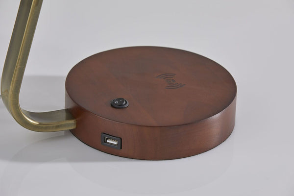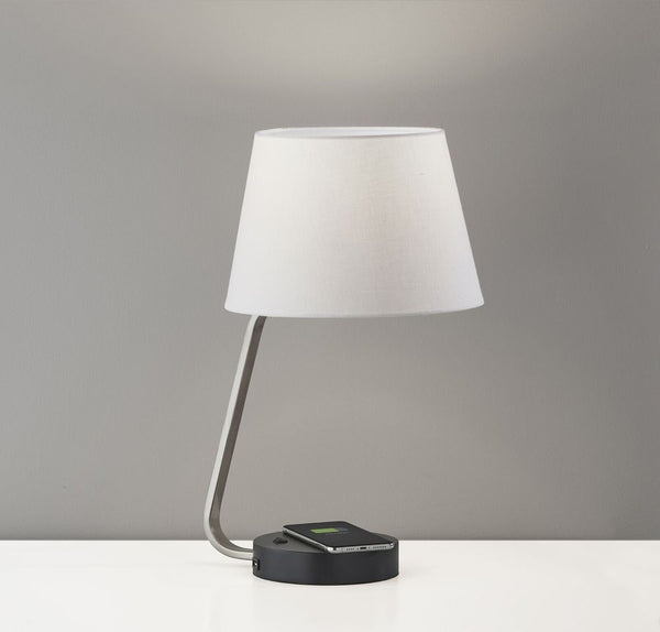This wireless charging table lamp combines Palm Desert, mid-century styling with high-tech features. A thick black wood base encases a hidden Qi wireless charging pad. Just place your phone onto the wood base, and your phone will charge right up! Many phones have Qi technology built-in already, but for those that don't, a USB port is conveniently located right in the base as well. Brushed Steel metal is paired with a white fabric shade, revealing a beautiful texture when lit. All lighting product is either UL or ETL listed, meaning that it has been tested and approved to meet the government-regulated safety standards for the USA. Bulb is not included.