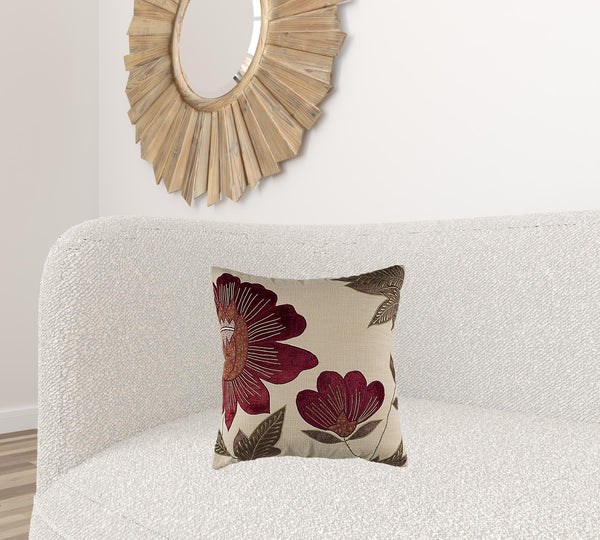 Bring a lovely springtime aura into your living space with this stunning Red Beige Floral Appliqued Throw Pillow that features an eye-catching design to serve as a centerpiece in the room. The floral and leaf patterns in velvet are appliqued over a beige-toned base with jacquard woven fabric and intricate embroidered detailing for visual interest. Crafted from lightly textured cotton material for a luxurious feel on the touch while ensuring enhanced durability to last long. This down-filled pillow is super soft and fluffy to support your neck and back for maximum comfort. If you want a touch of nature into your modern space, go for this floral styled throw pillow that will induce a cheerful atmosphere and increase the visual aesthetics of the room. 18” x 18” x 6.25”
