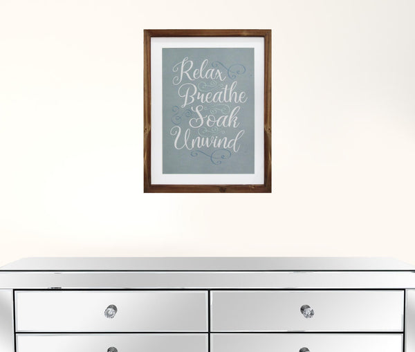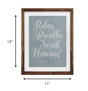 “Relax, Breathe, Soak, Unwind” Framed Wall Art brings the look and feel of a spa retreat to your home bath. This handcrafted wall art features a printed message in cursive type on beautiful blue art paper with a white mat border all around. A gorgeous wood and glass frame completes the look and makes it ready to hang. Overall Measurement:11.00 W X 1.00 D X 14.00 H