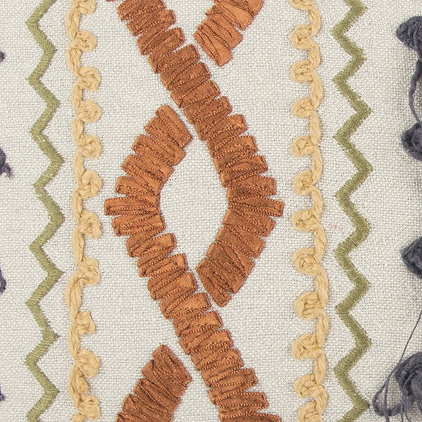 Craft an exquisite bohemian look on your sofa or bed with this Rust Gray Ribbon Embroidered Lumbar Pillow. Juxtaposing hand embroidery, ribbon embroidery, and machine stitchery, the pillow forms a variety of patterns in colors of rustic brown, gray, and gold over a white base to give this accent a true artisanal appeal while the tassel embellishments add dimension to the piece. The premium quality cotton base fabric ensures its resilience for years of use while the knife edging creates clean, polished, and sharp corners for a modern appeal. The pillow has a solid corresponding back with a concealed zipper to give it a seamless finish and make laundry easy. A piece of art on its own, this beautifully designed lumbar pillow will be an eye-catching element to your modern or traditional décor. 26” x 14” x 6.25”
