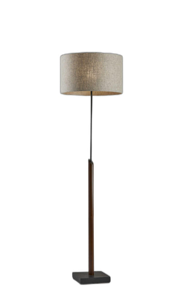 Crafted from walnut wood and black metals, this floor lamp provides an architectural modern style that looks good in any space. A natural fabric shade adds a rough-hewn texture. With a 10" square base, this lamp has a compact profile to sit wherever light is needed. A black fabric covered cord comes out elegantly from the base. Bulb is not included.