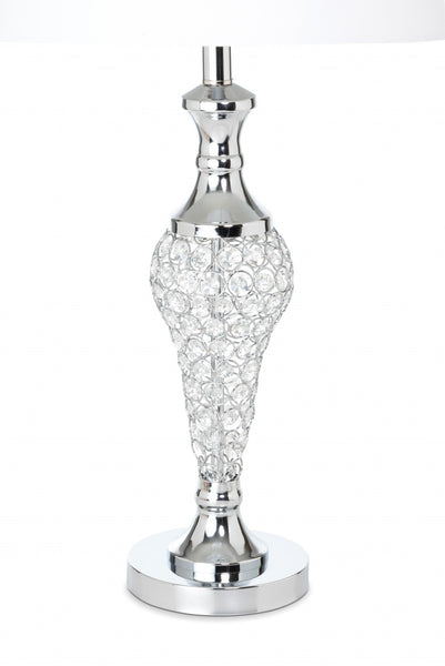 Induce a rich and luxurious tone into your home with the addition of this pair of Silver Acrylic Beads Metal Table Lamps that will add a timeless charm to any room you want it to illuminate. An upright torch-shaped metal base in a shiny silver finish is embellished with acrylic beads and topped with a white drum shade for visual intrigue. Crafted from a highly durable and sturdy metal that will last for years while providing a soft and relaxing glow to your space. From traditional, classic, to modern and contemporary settings, this alluring pair of table lamps will complement any style and theme and make your space look more magical and welcoming. 30” H each. Set of 2.