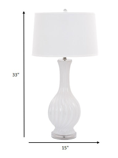 Cast a modern decorative spell to your living space with this Set of 2 White Curved Ceramic Table Lamps. The curvy white base is accented by subtle swirls for added texture and the smooth surface of the lampshade evokes a sense of modern elegance. When turned on, these table lamps will enliven your space with a mesmerizing source of light, but when turned off, they will accentuate the beauty of the room. Gorgeously crafted with ceramic and crystal to enhance the aesthetics of your contemporary décor while being an efficient lighting solution to revive any mundane part of your home. 33â H each. Set of 2.