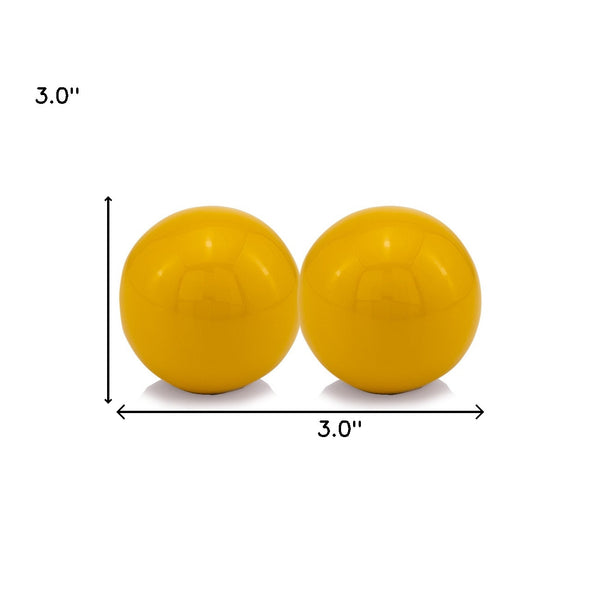 This Set of 2 Yellow Enameled Aluminum Spheres gives you a perfect pair of fashionable accents to spruce up your space. The 3" round orbs are shiny, polished, and superbly stunning in a vibrant yellow. Versatile in use, they can be anything from a sculpture, to paperweight, to filler in decorative bowl or jar.