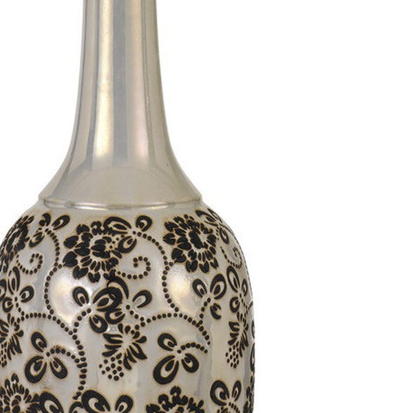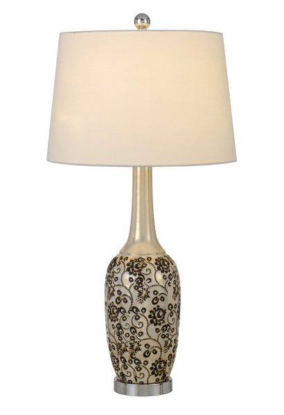 Transform your living room, dining room, or bedroom with this 30” Stylish Ceramic Pearl Table Lamp. This beautiful piece is made from the highest quality of ceramic, brushed steel, that gives it a beautiful and unique look.  The body has the structure of a long neck bottle and features an iridescent pearl finishing with black floral designs. The lampshade is made from thick fabric and is a simple white to complement the pearl and black design of the body. 30” x 15” x 15”