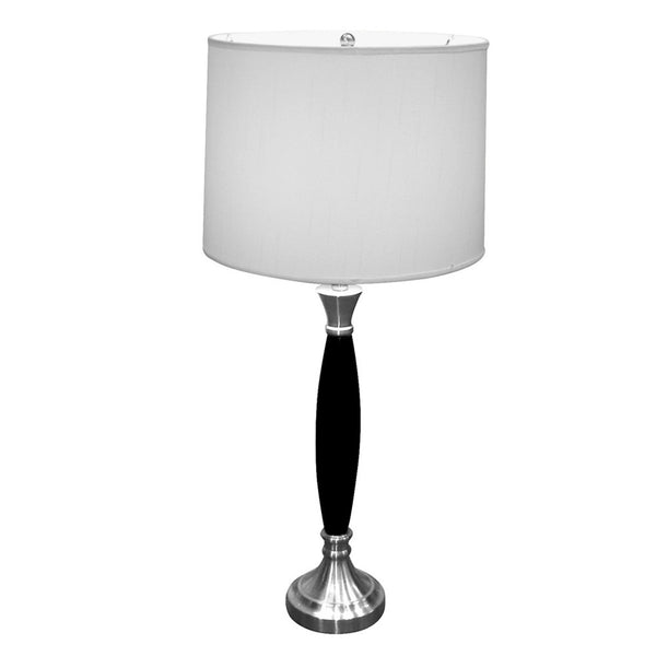 This Silver and Black Table Lamp will be the perfect way to add some design and brightness to any space in your home. The base is made of silver metal and is in a round shape. Coming up from this base there is a metal cylinder which has a black finish on it and is encapsulated by two silver borders on either side. The white fabric shade adds softness to the overall look of this lamp. This lamp can be used on its own or you can use a pair to elevate the look of any space. 30" H x 16" W x 16" D