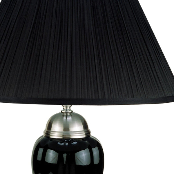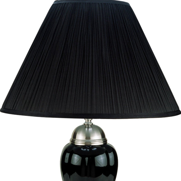 This Silver and Black Table Lamp with Black Shade is the perfect minimalist light piece for any space in your home. The base of this lamp is made of metal and colored to a shiny silver finish. The base has a tapered design with the base in a solid round shape. On top of this base, there are an urn shape that is made of black ceramic and is topped with another silver dome. The lamp shade is covered in a pleated black fabric that adds texture and depth to the overall look. This lamp will look great on its own or you can get a pair and finish off the decor in your bedroom or living room. 27" H x 16" W x 16" D