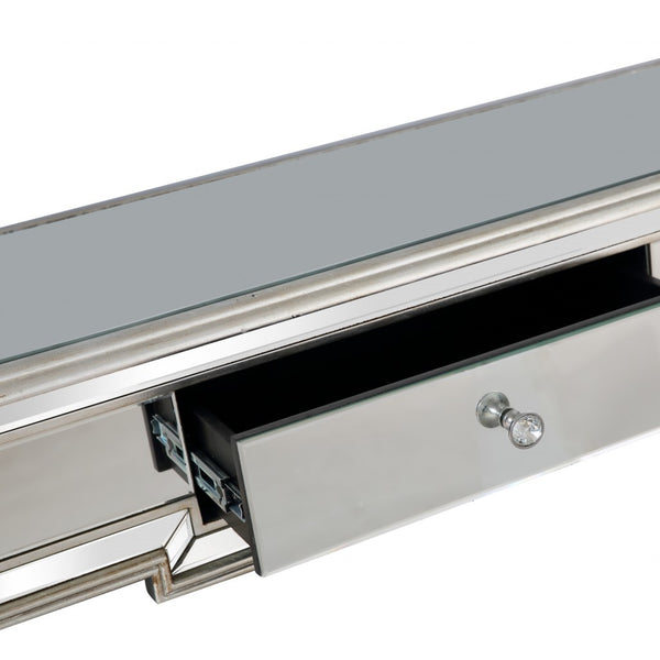 The Silver Leaf Antiqued Mirror Console is what you need to create a timeless look. The console features a combination of both clear and antique mirrors, making it a perfect decoration piece for any living space. The regal crystal knob and silver leaf with light antique finish give it a stylish appearance that blends seamlessly with modern or classic interior designs. The Silver Leaf Antiqued Mirror instantly creates an illusion of space with its rectangular shape and silver leaf finish. Clean and elegant, this well-made mirror features antique mirror strips along its borders that complement both modern and traditional interior designs. When paired with a lovely wall painting, this mirror adds an entirely new touch to your room. 33.2" x 48" x 17.2".
